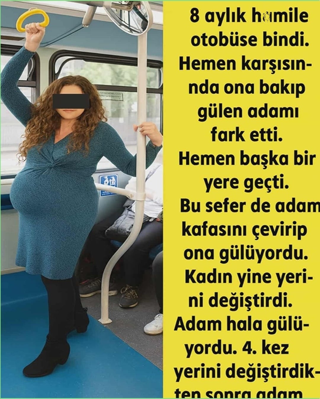 8 aylık hamile bir kadın otobüse binmiş ve bir süre sonra karşısında oturan adamın kendisine güldüğünü fark etmiştir. Bunun üzerine kadın başka bir koltuğa geçmiş ancak adam hala daha ona bakıp gülmektedir. Yine yerini değiştiren kadın, bu sefer adamın daha çok güldüğünü fark etmiştir.